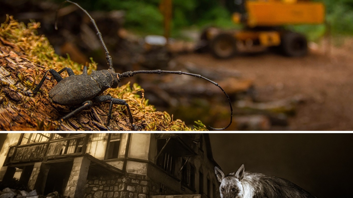 Un coleottero delle specie Morimus Asper è di vedetta sulla corteccia ricoperta di muschio di un tronco d’albero abbattuto e punta lo sguardo verso l’orizzonte. Ma ciò che vede non è l’immensità o la poesia di un paesaggio, ma la sagoma sfocata arancione di un pesante macchinario utilizzato per il disboscamento. È questa una delle foto vincitrici del Wildlife Photographer of the Year e a scattarla è stato un Italiano, Andrea Dominizi, che si aggiudica dunque il riconoscimento di «fotografo naturalista dell’anno» nella categoria dei giovani. Con lui è stato premiato, per la categoria adulti, a Wim van den Heever per la sua foto di una iena bruna ritratta nella notte nella città abbandonata di Kolmanskop, in Namibia.Â