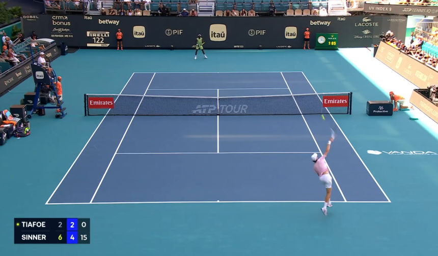 Uno dei punti più belli della vittoria di Jannik Sinner contro Frances Tiafoe nei quarti di finale del Masters 1000 di Miami: uno smash da fondocampo accolto con un "Ohhh" di stupore dal pubblico....