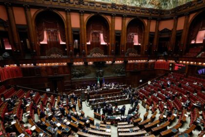 Copie della Costituzione sventolate alle spalle del deputato leghista Domenico Furgiuele...